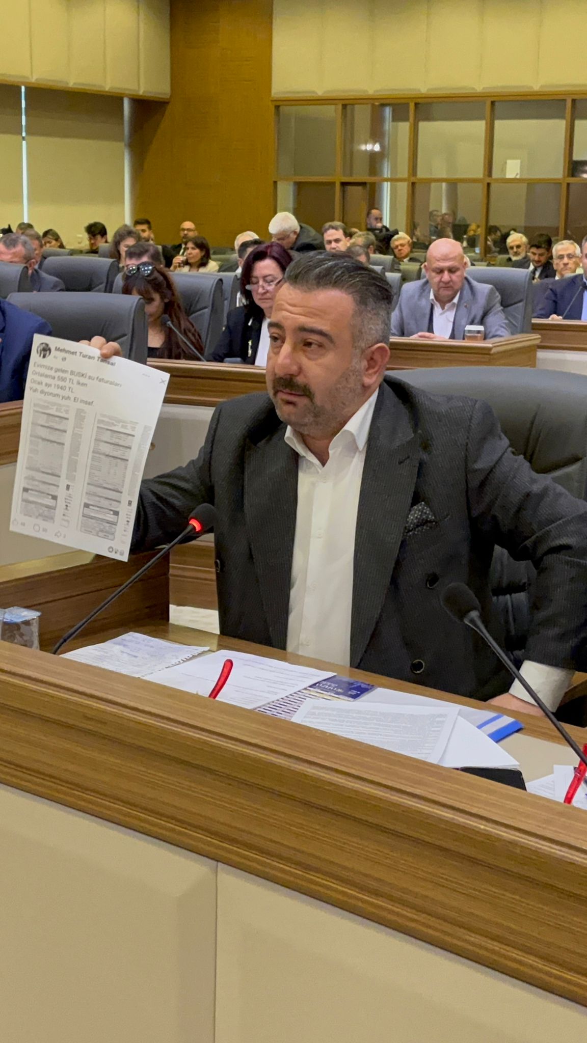 Burda 590 liralık faturanın 2000 TL’ye çıktığı görülüyor. Yaklaşık yüzde 400 zam yapmışsınız. Bu yüzde 400 zammı hem kendi belediye başkanlarınıza, hem bizim belediye başkanlarımıza, basın mensuplarına ve Bursa halkına 135 TL üzerinden açıklamaya çalışıyorsunuz. 135 TL’yi kılıf haline getirip 500 TL’lik faturayı 2000 TL olarak tahsil edemezsiniz.” dedi.