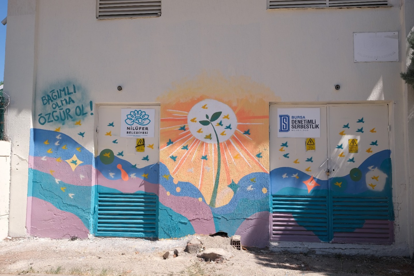etmeyi amaçlayan programa Nilüfer Belediyesi Sosyal Destek Hizmetleri Müdürlüğü Sağlık Hizmetleri Bürosu Bağımlılıkla Mücadele Birimi çalışanları, Bursa Denetimli Serbestlik Müdür Yardımcısı Erhan Delibaş, kurum personelleri, denetimli serbestlik tedbiri altında bulunan ve madde kullanımı olan yükümlüler katıldı. ‘Bağımlı Olma, Özgür Ol’ temasıyla hayata geçen etkinlikte katılımcılar, kendilerini sanatsal açıdan ifade ettiler. Nilüfer’de bulunan trafoya yeteneklerini yansıtan katılımcılar, ellerine aldıkları sprey boya ile özgürlüğü temsil eden ‘Güvercin’ temalı çizim gerçekleştirdiler.