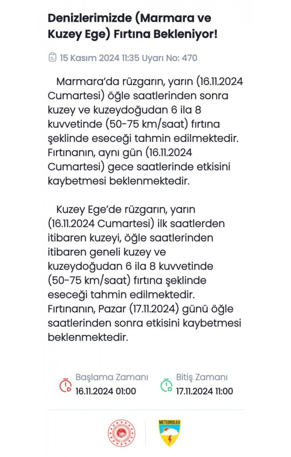Marmara’da rüzgarın, yarın (16.11.2024 Cumartesi) öğle saatlerinden sonra kuzey ve kuzeydoğudan 6 ila 8 kuvvetinde (50-75 km/saat) fırtına şeklinde eseceği tahmin edilmektedir. Fırtınanın, aynı gün (16.11.2024 Cumartesi) gece saatlerinde etkisini kaybetmesi beklenmektedir.Kuzey Ege’de rüzgarın, yarın (16.11.2024 Cumartesi) ilk saatlerden itibaren kuzeyi, öğle saatlerinden itibaren geneli kuzey ve kuzeydoğudan 6 ila 8 kuvvetinde (50-75 km/saat) fırtına şeklinde eseceği tahmin edilmektedir. Fırtınanın, Pazar (17.11.2024) günü öğle saatlerinden sonra etkisini kaybetmesi beklenmektedir.