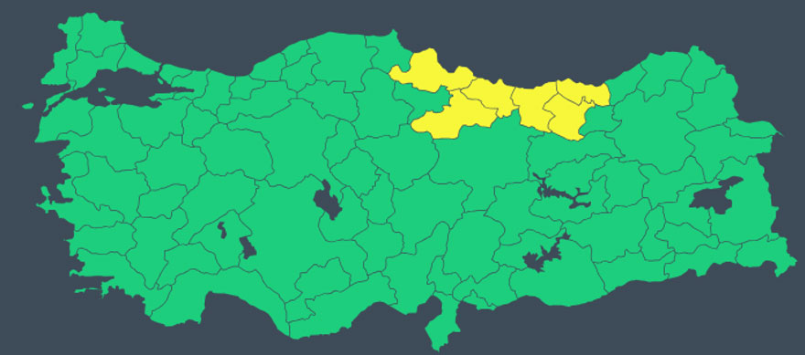 Yağışların genellikle karla karışık yağmur ve kar şeklinde olacağı, kıyı kesimlerde ise yağmur görüleceği tahmin ediliyor. MGM, Giresun, Gümüşhane, Ordu, Samsun, Tokat ve Trabzon için sarı kodlu uyarı yayınlayarak yağışların kuvvetli olacağını bildirdi. Kurumun web sitesinde yapılan açıklamada, bu bölgelerde heyelan, yüksek kesimlerde buzlanma ve don, çığ, sel ve su baskını riskine dikkat çekildi.