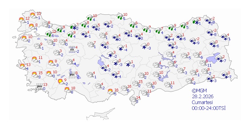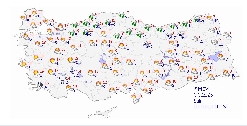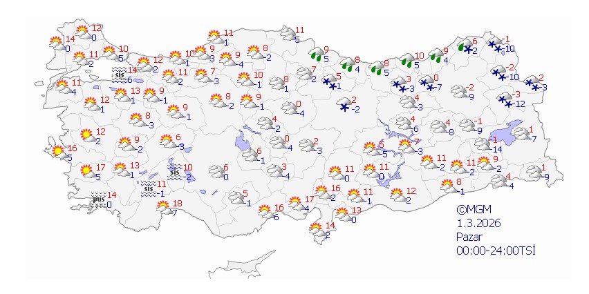 Orta ve Doğu Karadeniz kıyılarında saatte 40-70 kilometre hızla fırtına beklendiği duyuruldu. MGM, Pazar günü Doğu Karadeniz ile Kars, Ardahan ve Iğdır çevresinde yağışların devam edeceğini, yeni haftanın başında ise yurdun genelinde güneşli ancak soğuk havanın hakim olacağını belirtti.