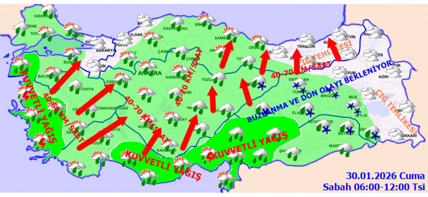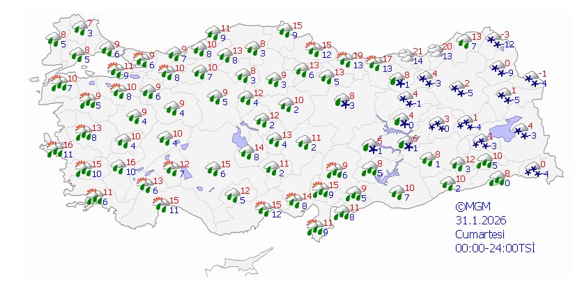 - Kar uyarısı: Adana, Bingöl, Diyarbakır, Elazığ, Adıyaman, Malatya, Kahramanmaraş, Batman, Tunceli
