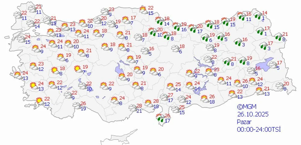 Meteoroloji Genel Müdürlüğü’nün son tahminlerine göre, ülke genelinde parçalı ve yer yer çok bulutlu hava etkili olacak. Marmara, Ege, Batı ve Doğu Akdeniz’in bazı kesimleri, İç Anadolu’nun kuzeybatısı, Karadeniz’in büyük bölümü ve Doğu Anadolu’nun yüksek kesimlerinde yağmur, sağanak, karla karışık yağmur ve yer yer kar yağışı bekleniyor.Balıkesir, Çanakkale, Edirne, İzmir, Kırklareli, Muğla ve Tekirdağ için sarı kodlu kuvvetli yağış uyarısı yapıldı. Özellikle Kuzey Ege kıyıları ile Edirne, Kırklareli’nin güneyi, Tekirdağ’ın batısı ve Çanakkale çevrelerinde yağışların kuvvetli olacağı belirtilerek, olası olumsuzluklara karşı dikkatli olunması istendi.