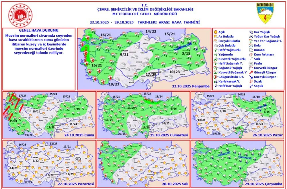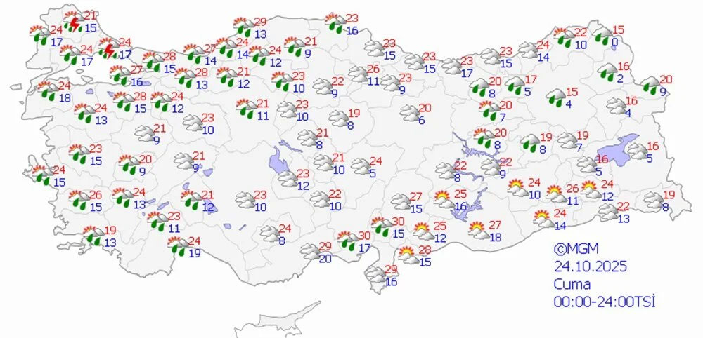 Meteoroloji Genel Müdürlüğü’nün son tahminlerine göre, ülke genelinde parçalı ve yer yer çok bulutlu hava etkili olacak. Marmara, Ege, Batı ve Doğu Akdeniz’in bazı kesimleri, İç Anadolu’nun kuzeybatısı, Karadeniz’in büyük bölümü ve Doğu Anadolu’nun yüksek kesimlerinde yağmur, sağanak, karla karışık yağmur ve yer yer kar yağışı bekleniyor.Balıkesir, Çanakkale, Edirne, İzmir, Kırklareli, Muğla ve Tekirdağ için sarı kodlu kuvvetli yağış uyarısı yapıldı. Özellikle Kuzey Ege kıyıları ile Edirne, Kırklareli’nin güneyi, Tekirdağ’ın batısı ve Çanakkale çevrelerinde yağışların kuvvetli olacağı belirtilerek, olası olumsuzluklara karşı dikkatli olunması istendi.