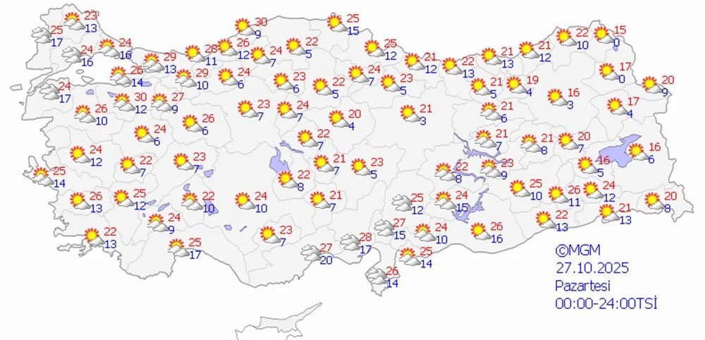 • İç Anadolu: Yağış az, hava parçalı bulutlu; Eskişehir 21, Kayseri 23 derece.