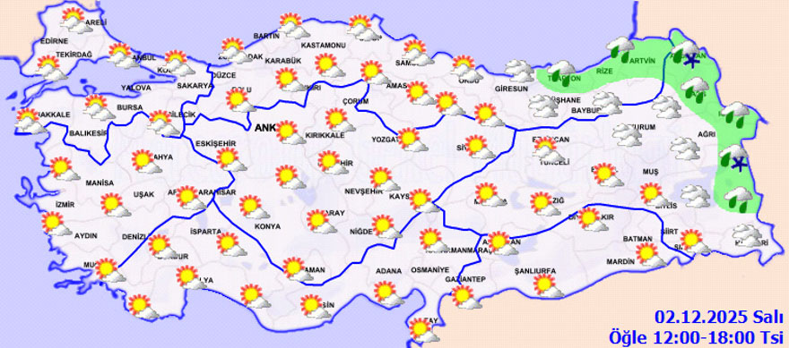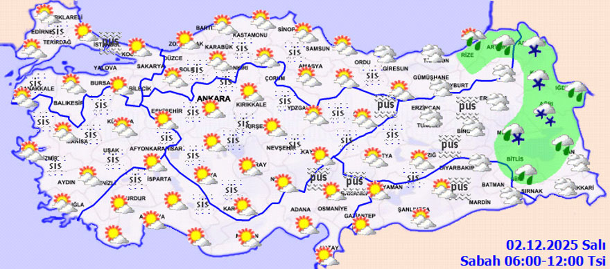 Meteoroloji Genel Müdürlüğü, Türkiye’nin kuzey ve doğu kesimlerinde yer yer çok bulutlu bir hava hakim olacağını açıkladı. Karadeniz kıyıları, Doğu Karadeniz’in iç kesimleri (Hakkari ve Şırnak hariç), Doğu Anadolu ile Bursa, Sakarya, Sivas ve Siirt çevrelerinde yağış bekleniyor. Yağışların kıyılarda sağanak, iç kesimlerde yağmur, Doğu Karadeniz ve Doğu Anadolu’nun yükseklerinde ise karla karışık yağmur ve kar şeklinde olacağı tahmin ediliyor.Sabah saatlerinde Marmara ve Ege kıyıları ile yurdun iç kesimlerinde pus ve yer yer sis, İç Anadolu’nun kuzeydoğusu ve Doğu Anadolu’nun kuzeyinde ise buzlanma ve don olayı görülecek.Hava sıcaklıklarının batıda 1-3 derece artması, diğer bölgelerde ise önemli bir değişiklik olmaması bekleniyor. Rüzgar genellikle güney yönlerden hafif, ara sıra orta kuvvette esecek.