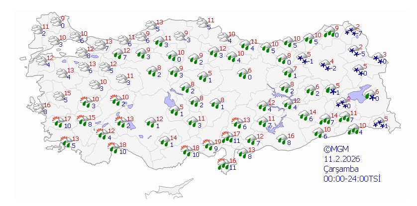 Yağışların çoğunlukla yağmur ve sağanak şeklinde görüleceği, Doğu Karadeniz’in iç kesimleri, Doğu Anadolu’nun doğusu ve Sivas çevrelerinde ise karla karışık yağmur ve kar şeklinde olacağı bildirildi.