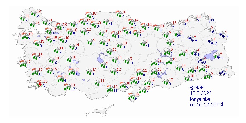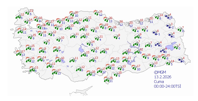 Yapılan değerlendirmelere göre, Türkiye genelinin parçalı ve çok bulutlu geçeceği tahmin ediliyor. Ege Bölgesi (Kütahya hariç), Akdeniz, Doğu Karadeniz, Doğu ve Güneydoğu Anadolu bölgeleri ile Çanakkale, Balıkesir, Konya, Karaman, Sivas, Ordu ve Tokat çevrelerinde aralıklı yağış bekleniyor.
