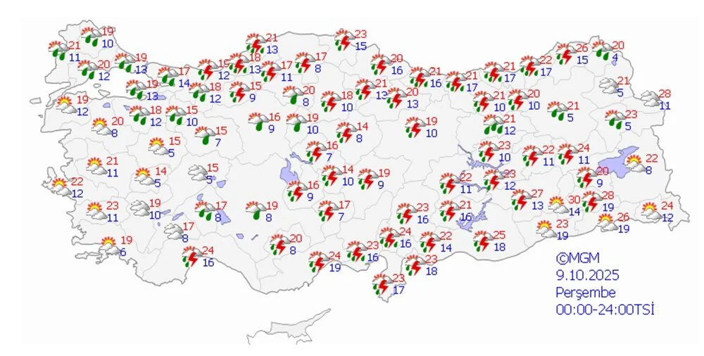 Meteoroloji, bugün öğleden sonra Bartın’da ve Zonguldak’ta yer yer çok kuvvetli sağanak beklendiğini bildirirken, Doğu Karadeniz kıyılarında da sabah saatlerinden itibaren aralıklı ve yerel kuvvetli yağışlar öngörülüyor. Ayrıca Adana, Osmaniye, Hatay ve Kahramanmaraş’ın bazı kesimlerinde de sağanak ve gök gürültülü yağışlar tahmin ediliyor. Vatandaşlardan, sel, su baskını, yıldırım, kuvvetli rüzgar, yerel dolu ve kıyı kesimlerde hortum riski gibi hava olaylarına karşı tedbirli olmaları, yetkililerin uyarılarını takip etmeleri istendi.