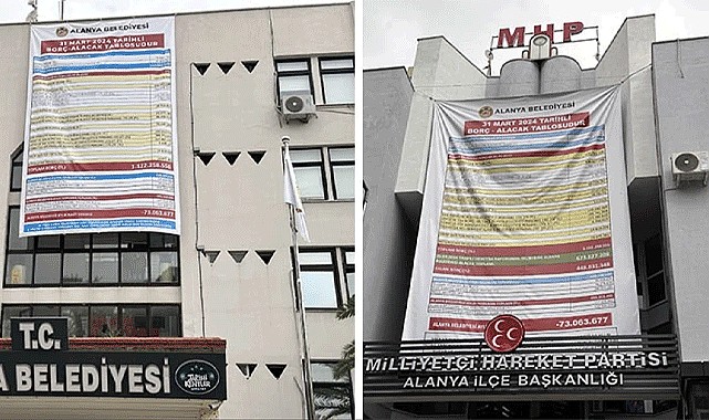 CHP’li Alanya Belediye Başkanı Osman Tarık Özçelik, belediyenin 1 milyar 122 milyon lira borcu olduğunu belirten bir afişle meydan okudu. Ancak MHP’nin cevabı gecikmedi. Parti binasına asılan dev bir afişle, belediyenin alacaklarını da hesaba katarak net borcun 448 milyon lira olduğu açıklandı. MHP’den yapılan açıklamada, “Sadece belediyenin borçları yazılarak algı oluşturmaya çalışıldığı ortadadır,” ifadeleri dikkat çekti.