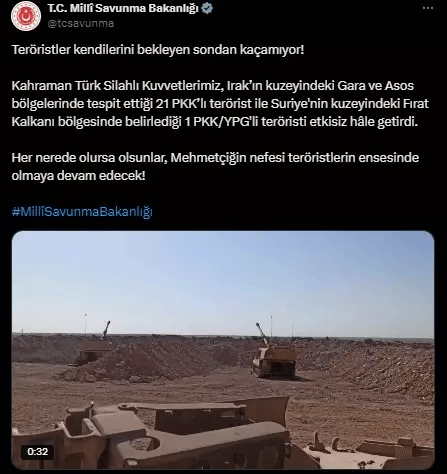 Türk Silahlı Kuvvetleri, bölücü terör örgütlerine yönelik operasyonlarına hız kesmeden devam ediyor. Milli Savunma Bakanlığı, Kuzey Irak ve Suriye’de toplam 22 teröristin etkisiz hale getirildiğini açıkladı. Açıklamada, Irak’ın kuzeyindeki Gara ve Asos bölgelerinde tespit edilen 21 PKK’lı terörist ile Suriye’nin kuzeyindeki Fırat Kalkanı bölgesinde belirlenen 1 PKK/YPG’li teröristin etkisiz hale getirildiği belirtildi. Bakanlık, “Teröristler kendilerini bekleyen sondan kaçamıyor. Kahraman Türk Silahlı Kuvvetlerimiz, her nerede olursa olsun, Mehmetçiğin nefesi teröristlerin ensesinde olmaya devam edecek” ifadelerine yer verdi.