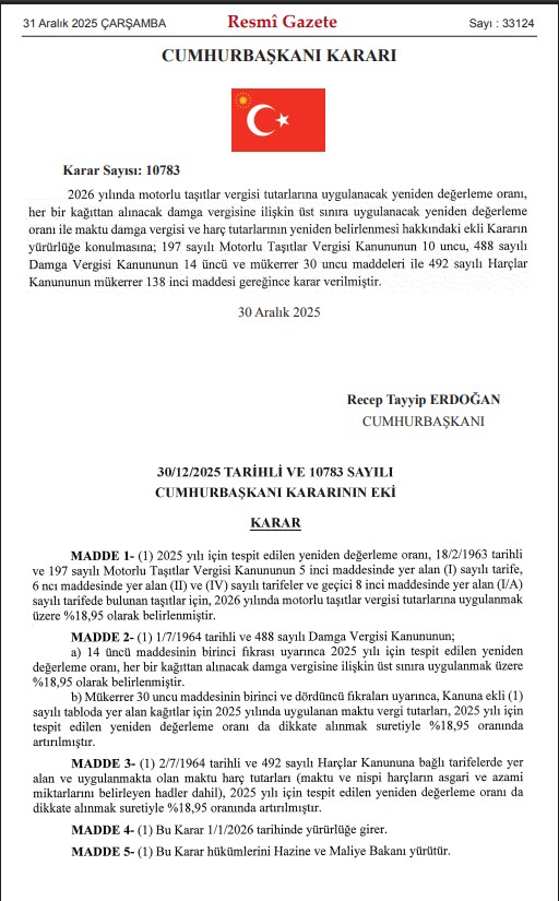 Araç sahipleri, beklenenden daha düşük MTV ödeyecek. Karar, Cumhurbaşkanı Recep Tayyip Erdoğan tarafından verildi ve Resmî Gazete’de yayımlanarak yürürlüğe girdi.
