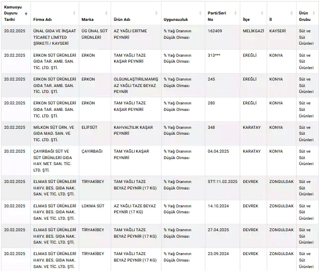 Gıda güvenliği denetimlerini aralıksız sürdüren Tarım ve Orman Bakanlığı, tespit edilen uygunsuzlukları resmi internet sitesi üzerinden duyurmaya devam ediyor. Kamuoyunun büyük bir dikkatle takip ettiği bu listeye, son güncelleme ile peynir ürünleri damgasını vurdu. Zonguldak’ta faaliyet gösteren Tiryakibey markası, 10 farklı ürünüyle denetim listesine girmeyi başardı. Yapılan analizlerde, bu ürünlerin beklenen yağ oranını sağlamadığı ortaya çıktı. Ayrıca, düşük yağ oranına sahip peynirlerin üretildiği şehirler de belirlendi. Konya, Kayseri, Elazığ, İzmir ve Aksaray gibi illerde üretilen bu ürünler, halk sağlığını tehdit eden unsurlar arasında yer aldı.