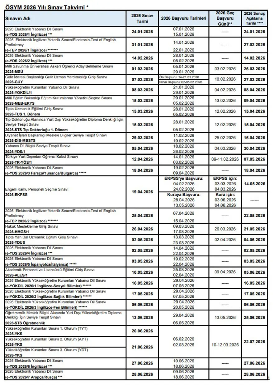ÖSYM Başkanı Prof. Dr. Bayram Ali Ersoy, yaptığı açıklamada 2026 sınav takvimini duyurdu. Ersoy, “Kıymetli adaylar, 2026 ÖSYM Sınav Takvimi belli oldu. Yükseköğretim Kurumları Sınavı (YKS) 20-21 Haziran’da, Dikey Geçiş Sınavı (DGS) 19 Temmuz’da, Millî Savunma Üniversitesi Askerî Öğrenci Aday Belirleme Sınavı (MSÜ) 1 Mart’ta gerçekleştirilecek.” ifadelerini kullandı.