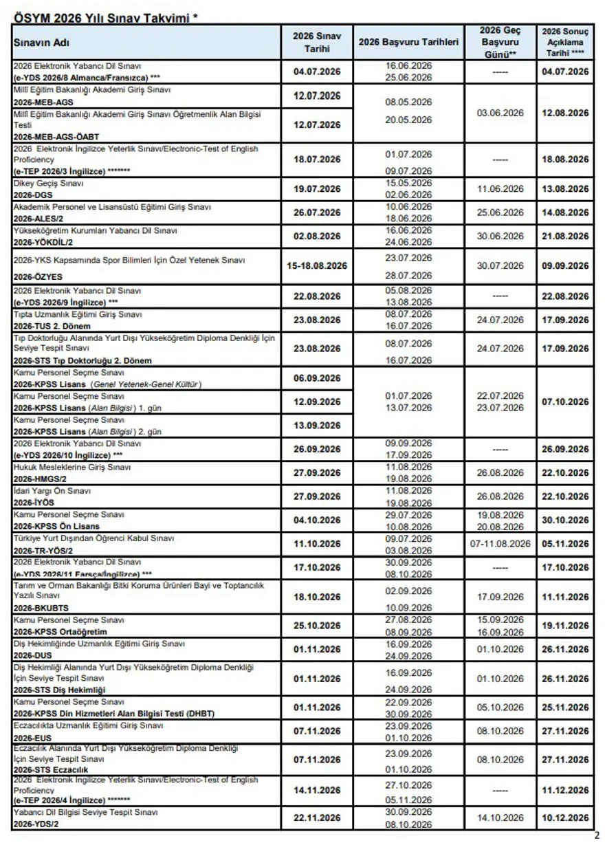 ÖSYM Başkanı Prof. Dr. Bayram Ali Ersoy, yaptığı açıklamada 2026 sınav takvimini duyurdu. Ersoy, “Kıymetli adaylar, 2026 ÖSYM Sınav Takvimi belli oldu. Yükseköğretim Kurumları Sınavı (YKS) 20-21 Haziran’da, Dikey Geçiş Sınavı (DGS) 19 Temmuz’da, Millî Savunma Üniversitesi Askerî Öğrenci Aday Belirleme Sınavı (MSÜ) 1 Mart’ta gerçekleştirilecek.” ifadelerini kullandı.