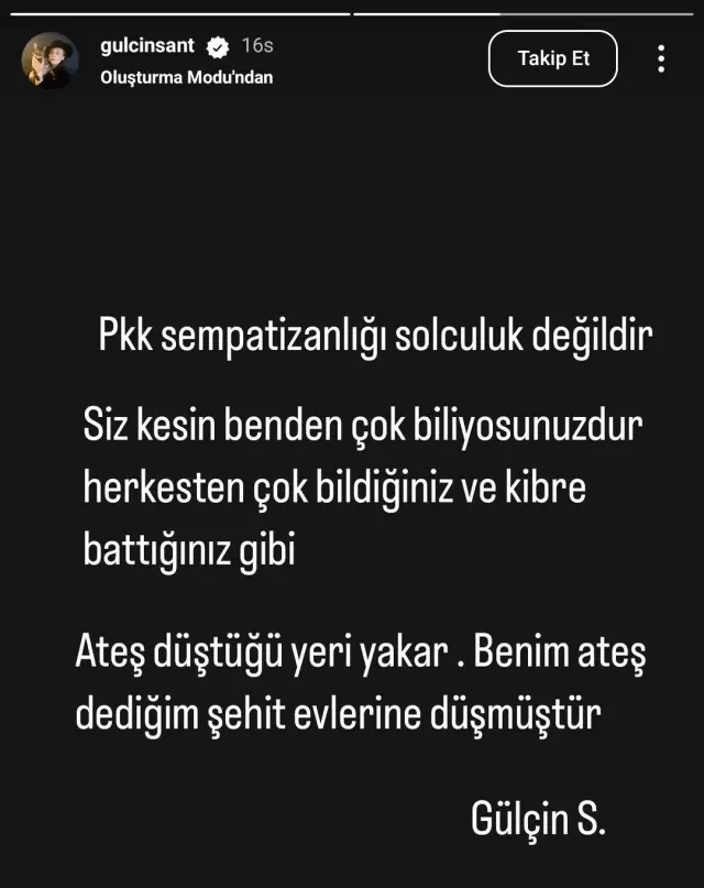 Oyuncu Gülçin Santırcıoğlu, sosyal medya hesabından yaptığı siyasi açıklamayla gündeme oturdu. Terör ve ideoloji üzerine dikkat çeken bir paylaşım yapan Santırcıoğlu, “PKK sempatizanlığı solculuk değildir. Siz kesin benden çok biliyorsunuzdur. Ateş düştüğü yeri yakar. Benim ateş dediğim şehit evlerine düşmüştür” ifadelerini kullandı.