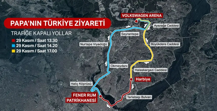 İstanbul Valiliği, Papa 14. Leo’nun İstanbul ziyareti nedeniyle 29 Kasım Cumartesi günü bazı yolların geçici olarak trafiğe kapatılacağını açıkladı. Yetkililer, sürücülerin alternatif güzergahları kullanmaları konusunda uyardı.