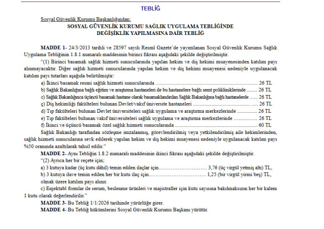 SGK tarafından 25 Ocak 2025’te yayımlanan tebliğle muayene katılım payları yüzde 233,3 ile yüzde 542,8 oranlarında artırılmış, gelen tepkiler üzerine 23 Şubat 2025’te yeni bir düzenlemeyle tutarlar 45 TL’den 20 TL’ye düşürülmüştü. Yeni tebliğle birlikte katılım payları 2026 yılı için yeniden güncellenmiş oldu.