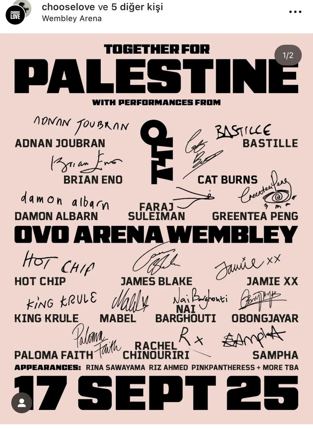 Konserde Bastille, James Blake, Paloma Faith, Jamie xx ve PinkPantheress gibi dünyaca ünlü sanatçılar yer alırken, Filistinli sanatçılar Sama’ Abdulhadi, Saint Levant ve Elyanna da sahne performanslarıyla dikkat çekti.Etkinliğin organizatörlüğünü üstlenen İngiliz sanatçı Brian Eno, konserin gerçekleştirilmesinin kolay olmadığını belirtti. “Filistin kelimesinin anılması bile çoğu yerde kesin ret demekti. Ancak son aylarda artan küresel farkındalık bu konseri mümkün kıldı” dedi.