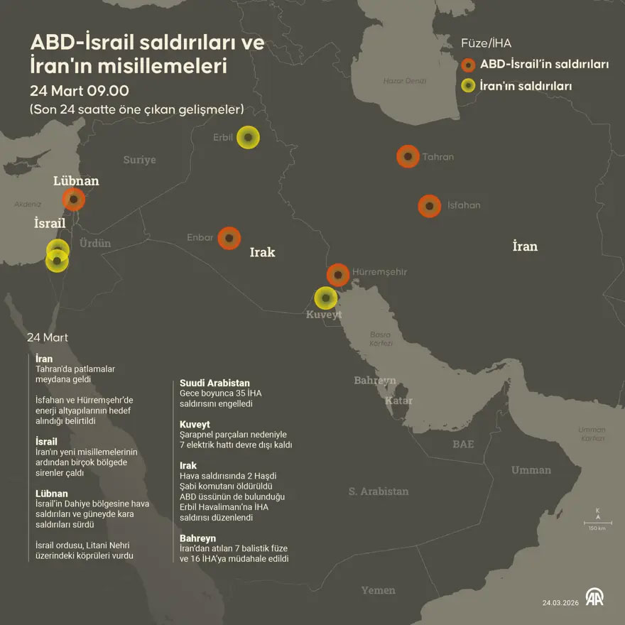 28 Şubat–23 Mart döneminde İran’ın misillemelerinde en çok hedeflenen ülke, 2 bin 156 füze ve İHA ile Birleşik Arap Emirlikleri oldu. Bunu 833 füze ve İHA ile Kuveyt takip etti.
