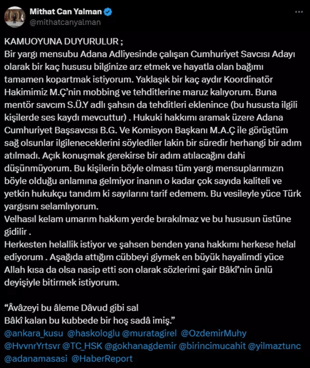 “Bir yargı mensubu Adana Adliyesinde çalışan Cumhuriyet Savcısı Adayı olarak bir kaç hususu bilginize arz etmek ve hayatla olan bağımı tamamen kopartmak istiyorum. Yaklaşık bir kaç aydır Koordinatör Hakimimiz M.Ç’nin mobbing ve tehditlerine maruz kalıyorum. Buna mentör savcım S.Ü.Y adlı şahsın da tehditleri eklenince (bu hususta ilgili kişilerde ses kaydı mevcuttur) hukuki hakkımı aramak üzere Adana Cumhuriyet Başsavcısı B.G. Ve Komisyon Başkanı M.A.Ç ile görüştüm sağ olsunlar ilgileneceklerini söylediler lakin bir süredir herhangi bir adım atılmadı.Açık konuşmak gerekirse bir adım atılacağını dahi düşünmüyorum. Bu kişilerin böyle olması tüm yargı mensuplarımızın böyle olduğu anlamına gelmiyor inanın o kadar çok sayıda kaliteli ve yetkin hukukçu tanıdım ki sayılarını tarif edemem. Bu vesileyle yüce Türk yargısını selamlıyorum. Velhasıl kelam umarım hakkım yerde bırakılmaz ve bu hususun üstüne gidilir. Herkesten helallik istiyor ve şahsen benden yana hakkımı herkese helal ediyorum. Aşağıda attığım cübbeyi giymek en büyük hayalimdi yüce Allah kısa da olsa nasip etti. Son olarak sözlerimi şair Bâkî’nin ünlü deyişiyle bitirmek istiyorum. “Âvâzeyi bu âleme Dâvud gibi sal Bâkî kalan bu kubbede bir hoş sadâ imiş.”