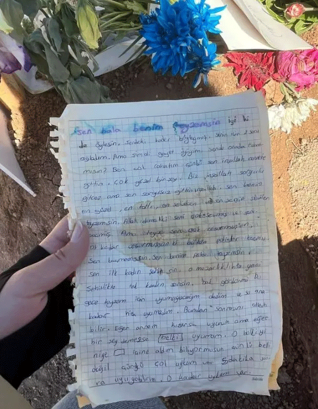 Ümraniye’de şehit edilen polis memuru Şeyda Yılmaz’ın yeğeni tarafından yazılan mektup, görenleri duygulandırdı. Mektubunda, “Sen benim aslan teyzemsin. Sen ilk kadın şehitsin o mezarlıkta.” ifadelerine yer veren genç, duygularını içten bir şekilde dile getirdi. Mektupta, “Sen benim teyzemsin. İyi ki de öylesin. Sendeki kader böyleymiş. Senin için 2 saat ağladım. Ama şimdi gayet iyiyim. Sen de orada rahat mısın? Ben çok rahatım. Çünkü sen inşallah cennete gittin. Çok güzel bir şey.” sözleri yer aldı.