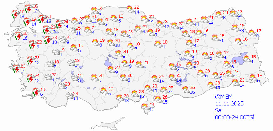 Bugün Tekirdağ, Sakarya, Bilecik, Eskişehir, Kütahya, Uşak, Muğla, Antalya, Aksaray ve Niğde çevrelerinde sağanak yağış geçişleri bekleniyor. Cumartesi ise Kıyı Ege, Doğu Akdeniz Toroslar bölgesi ile Edirne, Kırklareli, Çanakkale çevreleri, Erzurum, Muş ve Bitlis’in doğu ilçeleri ile Kars, Ağrı ve Van’ın batı kesimlerinde yağış etkili olacak.Özellikle bu akşam saatlerinde Antalya’nın doğu ilçelerinde yağışların yerel olarak kuvvetli olabileceği tahmin ediliyor.