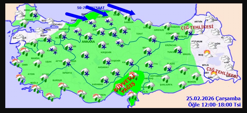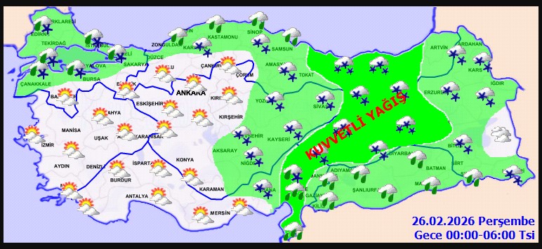 Batı Karadeniz kıyıları, Doğu Akdeniz, İç Anadolu’nun doğusu, Orta ve Doğu Karadeniz ile Doğu Anadolu’nun batısında yağışların kuvvetli olacağı bildirildi.