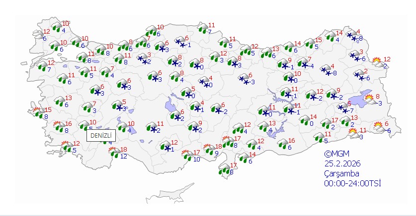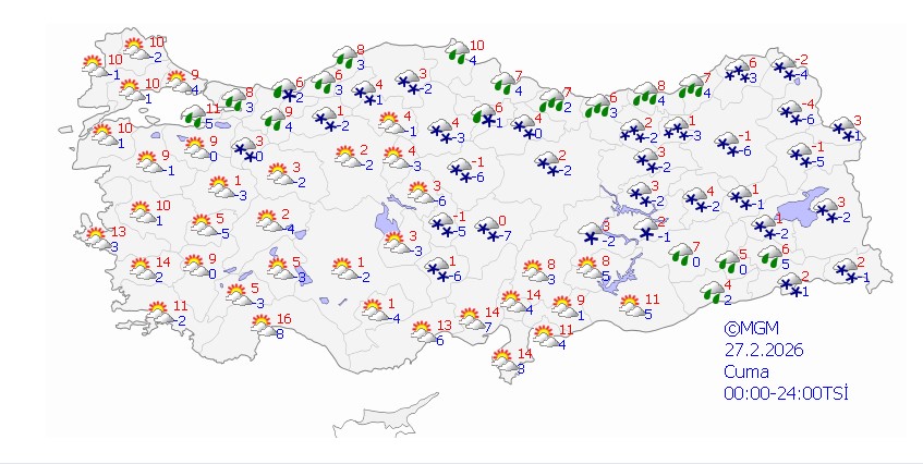 Meteoroloji Genel Müdürlüğü, bugün yurt genelinin parçalı ve çok bulutlu olacağını, Van dışında tüm bölgelerde yağış görüleceğini açıkladı. Yağışların genellikle yağmur ve sağanak şeklinde, iç ve doğu kesimlerde ise karla karışık yağmur ve kar şeklinde olacağı tahmin ediliyor.