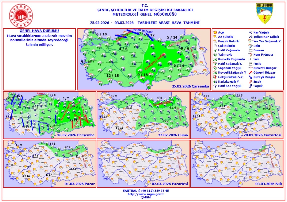 Meteoroloji Genel Müdürlüğü, bugün yurt genelinin parçalı ve çok bulutlu olacağını, Van dışında tüm bölgelerde yağış görüleceğini açıkladı. Yağışların genellikle yağmur ve sağanak şeklinde, iç ve doğu kesimlerde ise karla karışık yağmur ve kar şeklinde olacağı tahmin ediliyor.