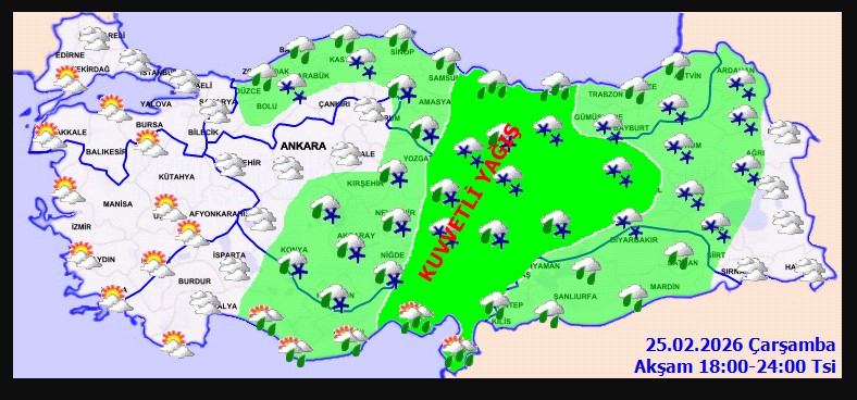 Batı Karadeniz kıyıları, Doğu Akdeniz, İç Anadolu’nun doğusu, Orta ve Doğu Karadeniz ile Doğu Anadolu’nun batısında yağışların kuvvetli olacağı bildirildi.