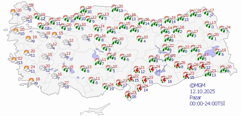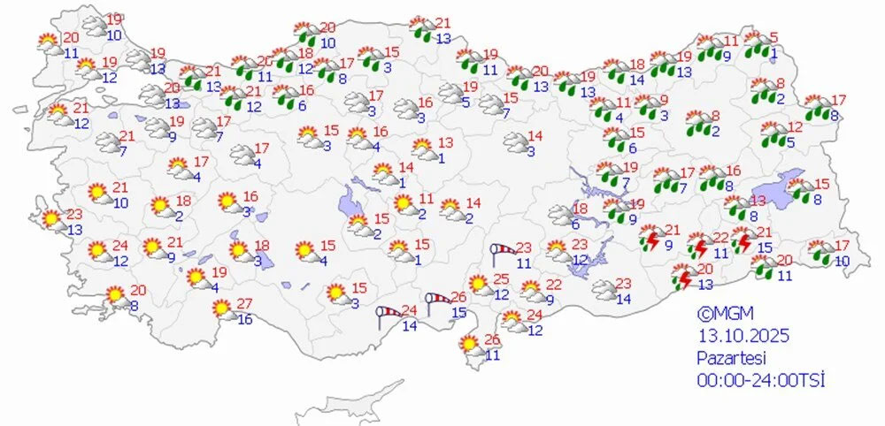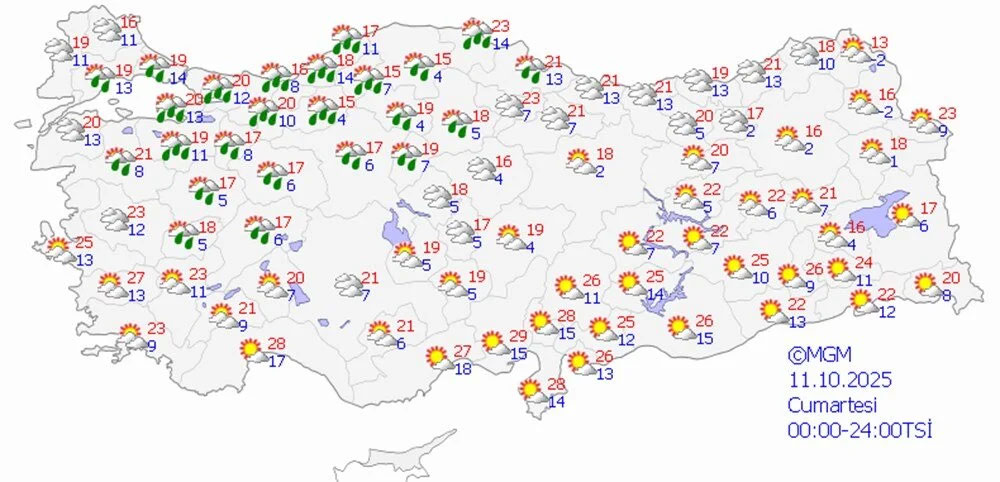 Meteoroloji Genel Müdürlüğü’nün son tahminlerine göre; Marmara, Batı ve Doğu Karadeniz kıyıları ile Eskişehir ve Ordu çevrelerinde yağmur ve sağanak yağış bekleniyor. Diğer bölgelerde ise havanın az bulutlu ve açık geçmesi öngörülüyor.Öte yandan, Düzce, Zonguldak, Bartın çevreleri ile Kocaeli, Sakarya ve Kastamonu’nun kuzey kesimleri için sarı kodlu kuvvetli sağanak yağış uyarısı yapıldı. Vatandaşların sel ve su baskınlarına karşı tedbirli olmaları istendi.