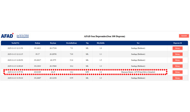 Afet ve Acil Durum Yönetimi Başkanlığı (AFAD), Marmara Denizi Silivri açıklarında saat 11.57’de 3.4 büyüklüğünde bir deprem meydana geldiğini duyurdu. Depremin 14.2 kilometre derinlikte gerçekleştiği bildirildi. Sarsıntı İstanbul’un birçok ilçesinde hafif şekilde hissedildi, ilk belirlemelere göre herhangi bir olumsuzluk yaşanmadı.