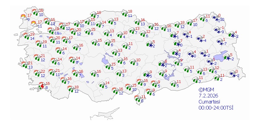Meteoroloji Genel Müdürlüğü (MGM), günlük hava tahmini raporunu yayımladı. Ülke genelinde sıcaklıklar yükselirken, bazı bölgelerde kuvvetli yağış ve rüzgar etkili olacak. Batı ve güney kesimlerinde etkili olan yağışlı hava yerini güneşe bırakıyor. İç Anadolu, Karadeniz ve Doğu Anadolu’da ise yağmur ve kar bekleniyor. Bugün soğuk hava etkili olsa da yarın lodos rüzgarları ile sıcaklıklar artacak. Önümüzdeki günlerde ülke genelinde sıcaklıkların 7 dereceye kadar yükselmesi öngörülüyor.