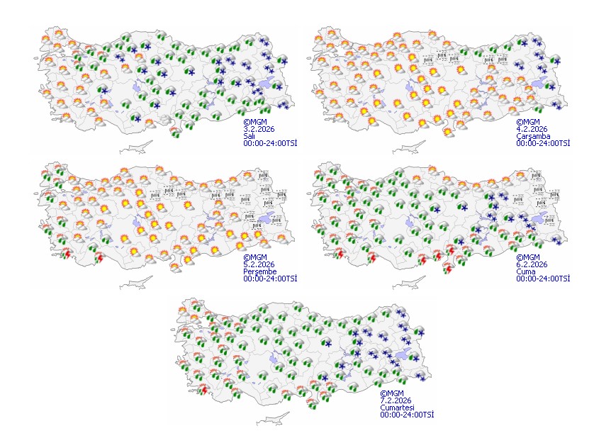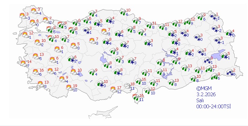 Meteoroloji Genel Müdürlüğü (MGM), günlük hava tahmini raporunu yayımladı. Ülke genelinde sıcaklıklar yükselirken, bazı bölgelerde kuvvetli yağış ve rüzgar etkili olacak. Batı ve güney kesimlerinde etkili olan yağışlı hava yerini güneşe bırakıyor. İç Anadolu, Karadeniz ve Doğu Anadolu’da ise yağmur ve kar bekleniyor. Bugün soğuk hava etkili olsa da yarın lodos rüzgarları ile sıcaklıklar artacak. Önümüzdeki günlerde ülke genelinde sıcaklıkların 7 dereceye kadar yükselmesi öngörülüyor.