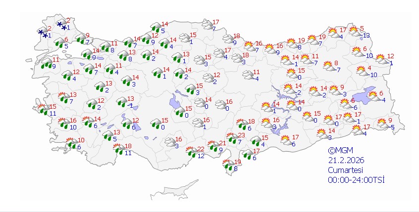 Meteoroloji Genel Müdürlüğü (MGM) verilerine göre bugün Batı ve Doğu Karadeniz, Orta Karadeniz kıyıları, Doğu ve Güneydoğu Anadolu ile Ankara’nın kuzeyi, Sivas, Hatay, Osmaniye ve Kahramanmaraş çevrelerinde aralıklı yağış bekleniyor. Özellikle Artvin kıyıları ve Rize çevresinde yağışların kuvvetli olması öngörülüyor.