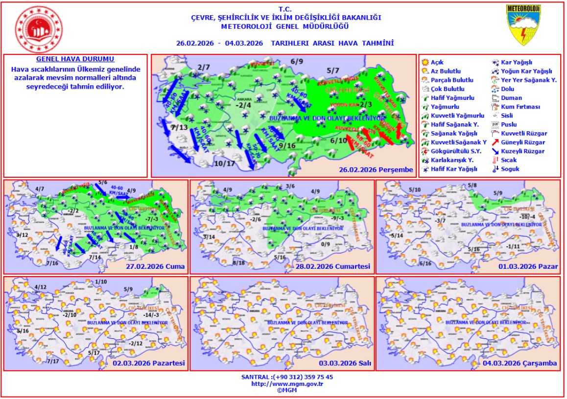 26 Şubat – 05 Mart 2026 tarihleri arasında MGM’nin açıkladığı en düşük sıcaklık tahminleri şöyle: