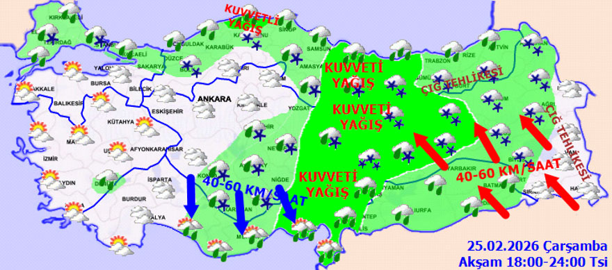 MGM tahminlerine göre; Doğu Akdeniz, Doğu Karadeniz, Doğu Anadolu, Sivas, Kayseri, Ordu, Tokat, Gaziantep, Kilis, Adıyaman, Diyarbakır, Siirt ve Kastamonu kıyılarında kuvvetli yağış öngörülüyor. İç ve doğu illerinde kar, diğer bölgelerde sağanak yağış bekleniyor.