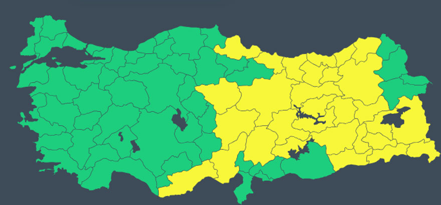 MGM, Adıyaman, Artvin, Bingöl, Bitlis, Diyarbakır, Elazığ, Erzincan, Erzurum, Giresun, Gümüşhane, Hakkari, Kayseri, Malatya, Kahramanmaraş, Muş, Ordu, Rize, Samsun, Siirt, Sivas, Trabzon, Tunceli, Van, Yozgat, Bayburt, Batman ve Şırnak için sarı kodlu yoğun kar uyarısı yayınladı.