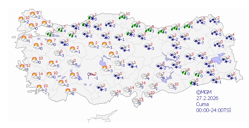 Meteoroloji Genel Müdürlüğü (MGM) verilerine göre, soğuk ve yağışlı hava yurt genelinde etkili olacak. Yağışlar kıyı kesimlerde yağmur, kuzey, iç ve doğu kesimlerde ise karla karışık yağmur ve kar şeklinde görülecek. Tahminlere göre, önümüzdeki günlerde yağışlı hava doğuya doğru hareket edecek ve pazar günü itibarıyla yerini soğuk ama yağışsız bir hava kütlesine bırakacak.