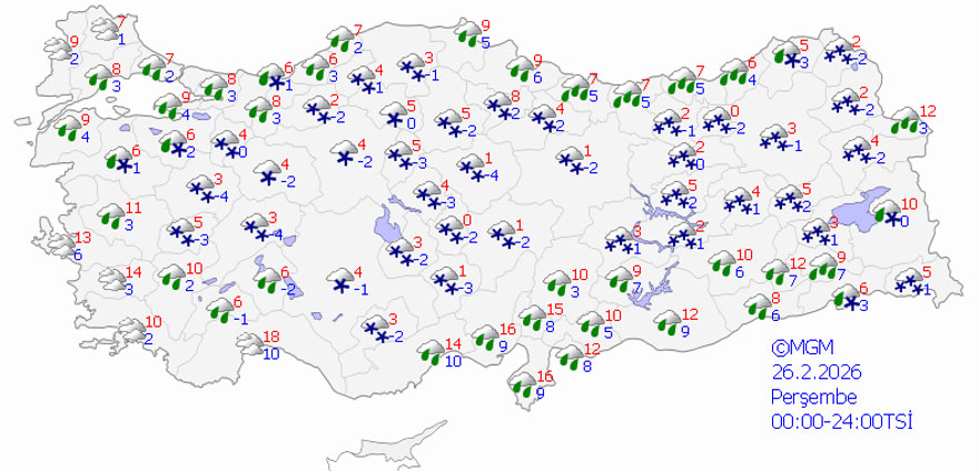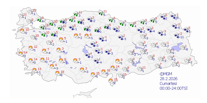 MGM tahminlerine göre; Doğu Akdeniz, Doğu Karadeniz, Doğu Anadolu, Sivas, Kayseri, Ordu, Tokat, Gaziantep, Kilis, Adıyaman, Diyarbakır, Siirt ve Kastamonu kıyılarında kuvvetli yağış öngörülüyor. İç ve doğu illerinde kar, diğer bölgelerde sağanak yağış bekleniyor.