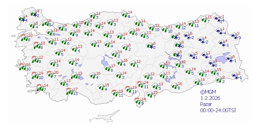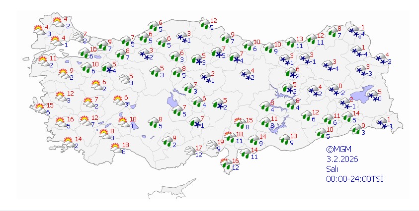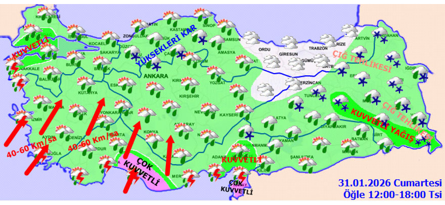 MGM, Bitlis, Diyarbakır, Hakkari, Siirt, Batman ve Şırnak’a kar; Adana, Antalya, Aydın, Balıkesir, Çanakkale, Hatay, Mersin, İzmir, Manisa, Kahramanmaraş, Muğla ve Osmaniye’ye kuvvetli sağanak uyarısı yaptı.