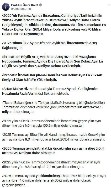 Ticaret Bakanı Ömer Bolat, X hesabından yaptığı açıklamada, 2025 yılı Temmuz ayında Türkiye’nin ihracatının Cumhuriyet tarihinin en yüksek aylık seviyesine ulaştığını duyurdu. Bolat, ihracatın 24,9 milyar dolar olarak gerçekleştiğini belirterek, yıllıklandırılmış ihracatın ise 269,4 milyar dolarla rekor kırdığını ifade etti.