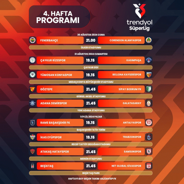 Trendyol Süper Lig’de 19 takımın mücadele ettiği sezonda, her hafta bir takım maç yapmadan geçiyor. Bu doğrultuda, 3. haftada Beşiktaş’ın, 4. haftada ise Gaziantep FK’nın bay geçeceği açıklandı.
