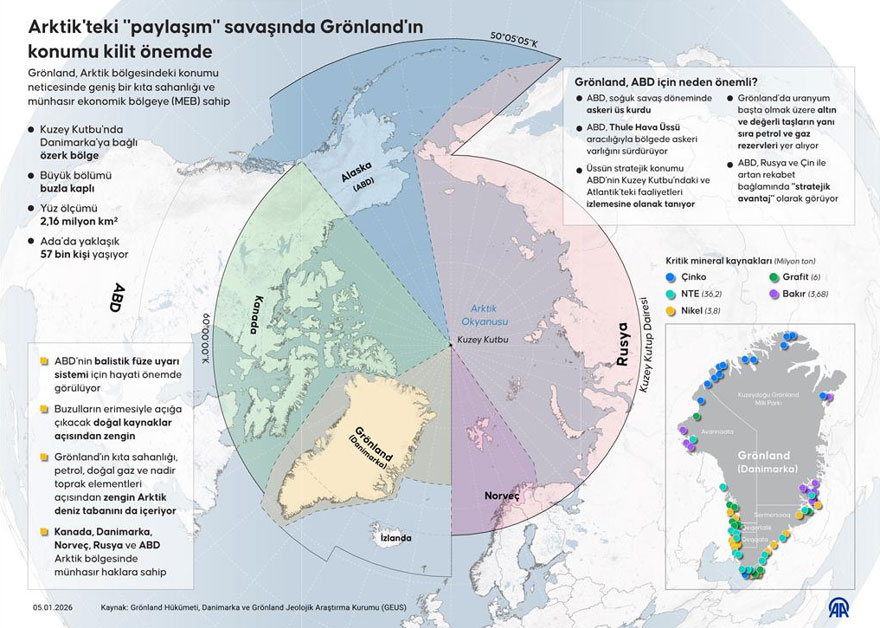 Arktik bölgesinde yer alan Grönland, geniş kıta sahanlığı ve münhasır ekonomik bölgesiyle dikkat çekiyor. Nadir toprak elementleri açısından zengin olan ada, ileri teknoloji, savunma sanayi ve enerji sektörleri için kritik öneme sahip. Ayrıca Kuzey Kutbu’nda buzulların erimesiyle yeni deniz ticaret yollarının açılması bekleniyor. ABD’nin adada Pituffik Uzay Üssü bulunmasına rağmen, Trump yönetimi tüm ada üzerinde kontrol hedefini dile getiriyor.