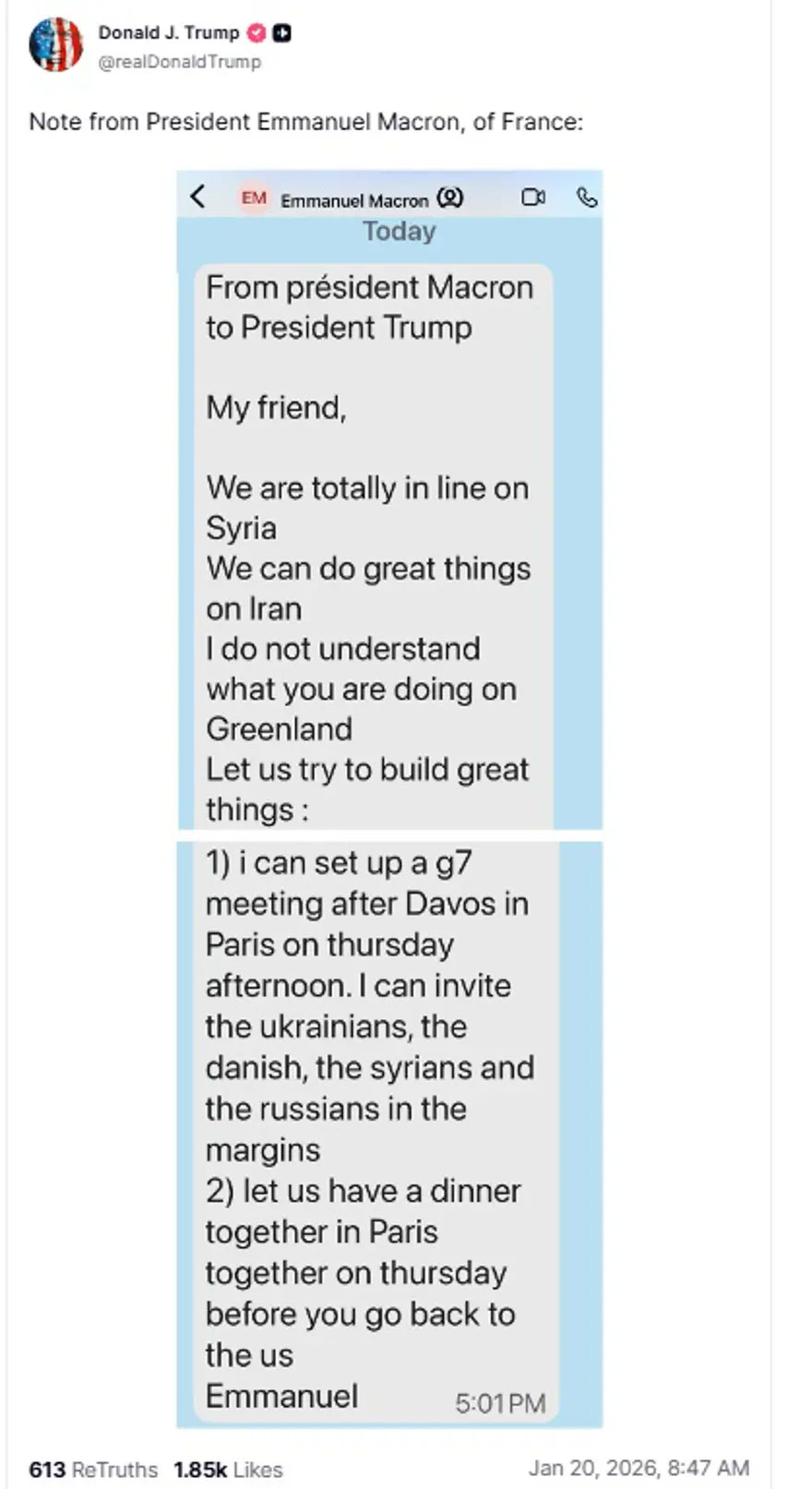 ABD Başkanı Donald Trump, Fransa Cumhurbaşkanı Emmanuel Macron’un kendisine gönderdiği mesajın ekran görüntüsünü sosyal medya platformu Truth’ta paylaştı. Paylaşılan mesajda Macron’un Trump’a, “Suriye konusunda tamamen aynı fikirdeyiz. İran konusunda büyük şeyler yapabiliriz. Grönland konusunda ise ne yaptığını anlamıyorum” ifadelerini kullandığı görüldü.