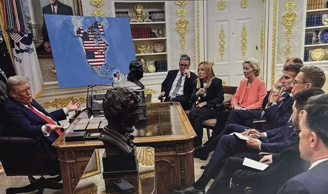 Trump, Truth hesabından paylaştığı bir başka görselle de tartışma yarattı. Görselde, Trump’ın masasında oturduğu ve yanında Grönland, Kanada ve Venezuela’nın ABD toprağı olarak gösterildiği bir harita dikkat çekti.Söz konusu görselde Trump’ın karşısında İngiltere Başbakanı Keir Starmer, İtalya Başbakanı Giorgia Meloni, AB Komisyonu Başkanı Ursula von der Leyen, Almanya Başbakanı Friedrich Merz, Fransa Cumhurbaşkanı Emmanuel Macron ve NATO Genel Sekreteri Mark Rutte’nin yer aldığı görüldü.
