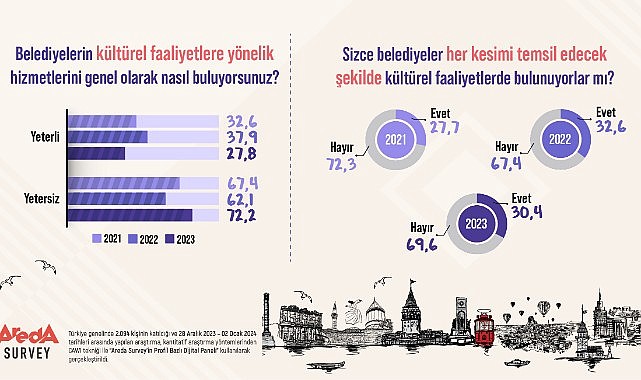 Areda Survey araştırma şirketi, belediyelerin kültürel faaliyetleriyle ilgili hizmetlerin halktaki yansımasını araştırdı. Türkiye genelinde 2.094 kişinin katıldığı araştırmada, halkın yüzde 72,2’si belediyelerin kültürel faaliyetlere yönelik hizmetlerini yetersiz buluyor. Yüzde 69,6’sı ise belediyelerin her kesimi temsil edecek şekilde kültürel faaliyetler düzenlemediğini düşünüyor.