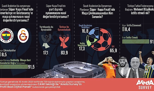 Areda Survey, Süper Kupa Finali’ne dair yaşanan krizin akşamında, CAWI yöntemiyle Türkiye genelinde 720 kişinin katılımıyla Türk halkının ne düşündüğünü araştırdı. Krizden birkaç saat sonra gerçekleştirilen araştırmaya göre, Türk halkının yüzde 83,9’u Türkiye Süper Kupa Finali’nin Türkiye’de oynanması görüşünde bir araya geliyor. Futbol kulüplerinin maça çıkmayıp yurda dönmesini yüzde 91,5 oranında destekliyor. Katılımcılar, Türkiye Futbol Federasyonu’nu (TFF) yüzde 65,9 ile yaşanan
