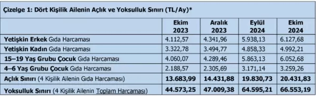 Türk-İş’in ekim ayı verilerine göre, açlık sınırı 20.431 TL’ye, yoksulluk sınırı ise 66.553 TL’ye yükseldi. Böylece açlık sınırı ile asgari ücret arasındaki fark 3.429 TL’ye ulaştı. Araştırmaya göre, Ankara’da yaşayan dört kişilik bir ailenin sağlıklı ve dengeli beslenmesi için gereken aylık gıda harcaması 20.431,83 TL, diğer zorunlu harcamalarla birlikte yoksulluk sınırı ise 66.553,19 TL olarak belirlendi.